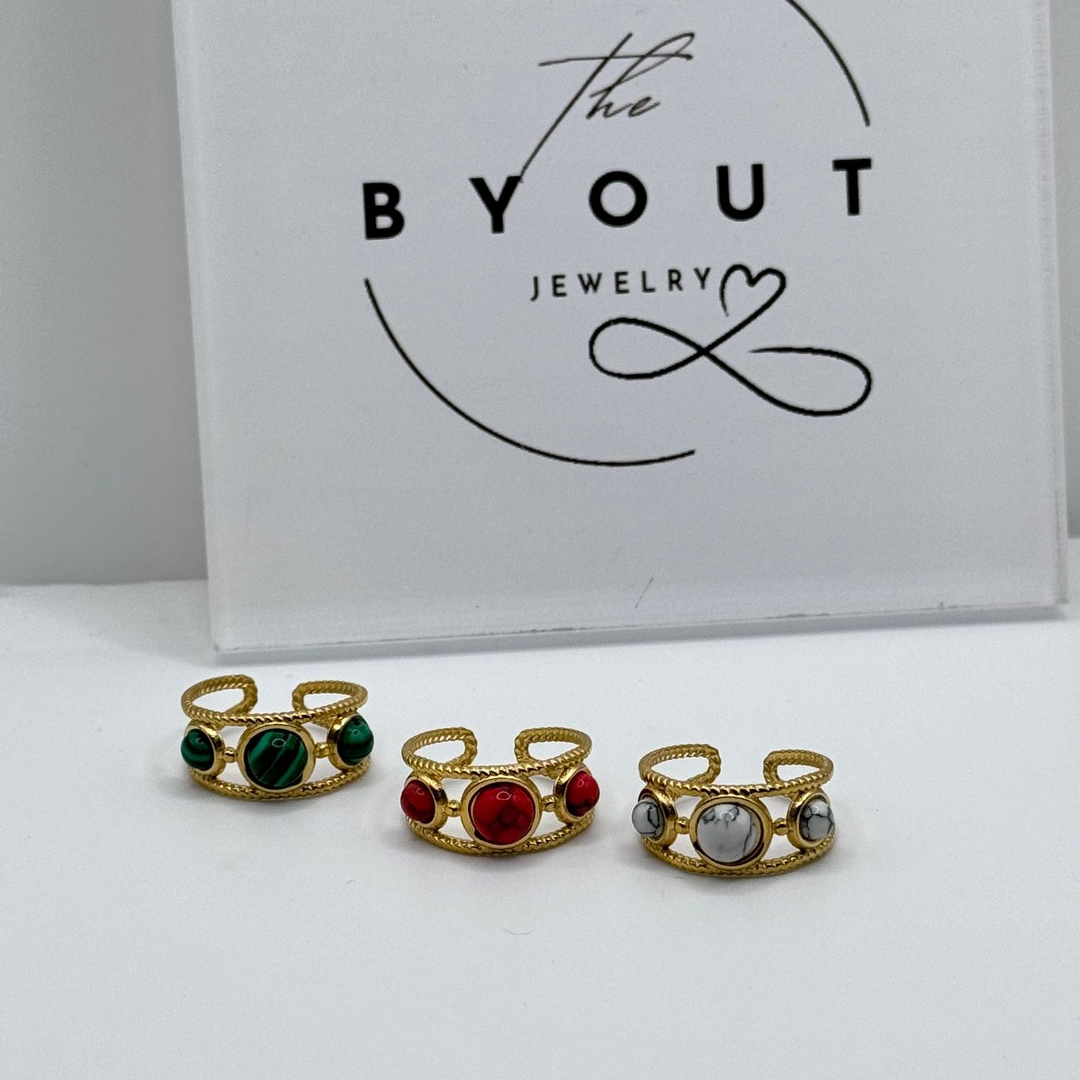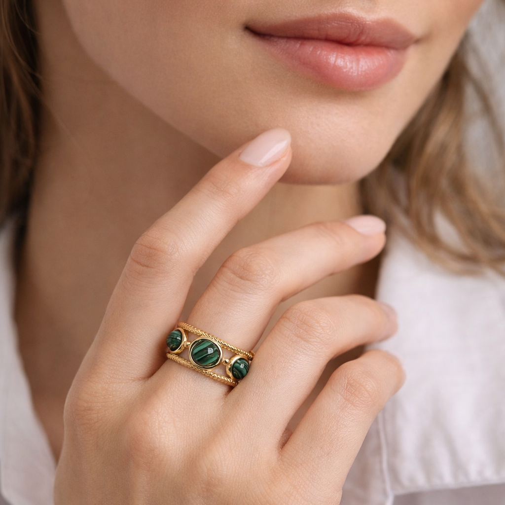 El anillo Alison dorado con tres piedras naturales es una pieza diseñada para mujeres que buscan elegancia, versatilidad y estilo en un solo accesorio.