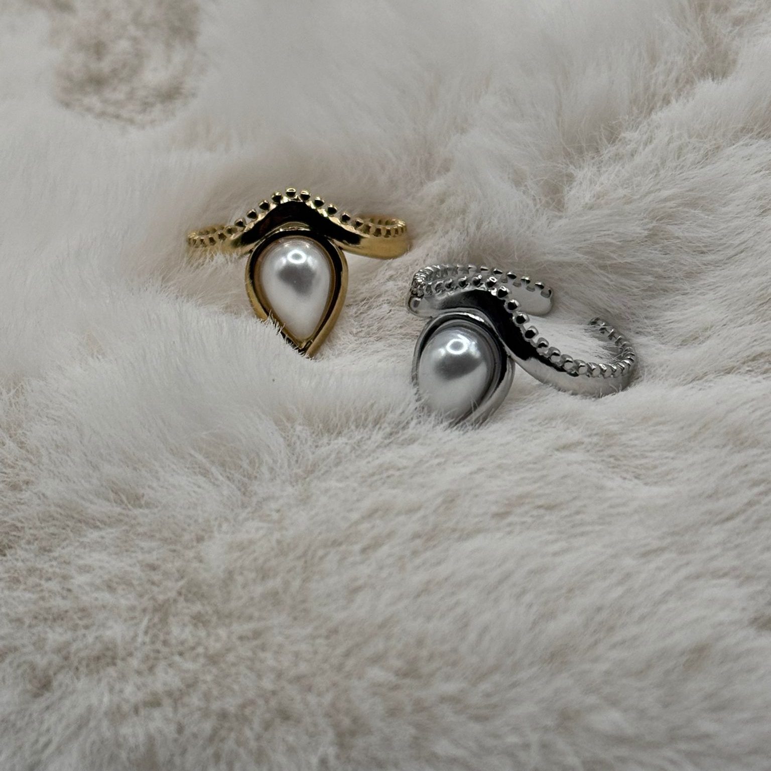 Estos anillos destacan por su distintivo diseño en forma de lágrima, protagonizado por una perla central que aporta luminosidad.