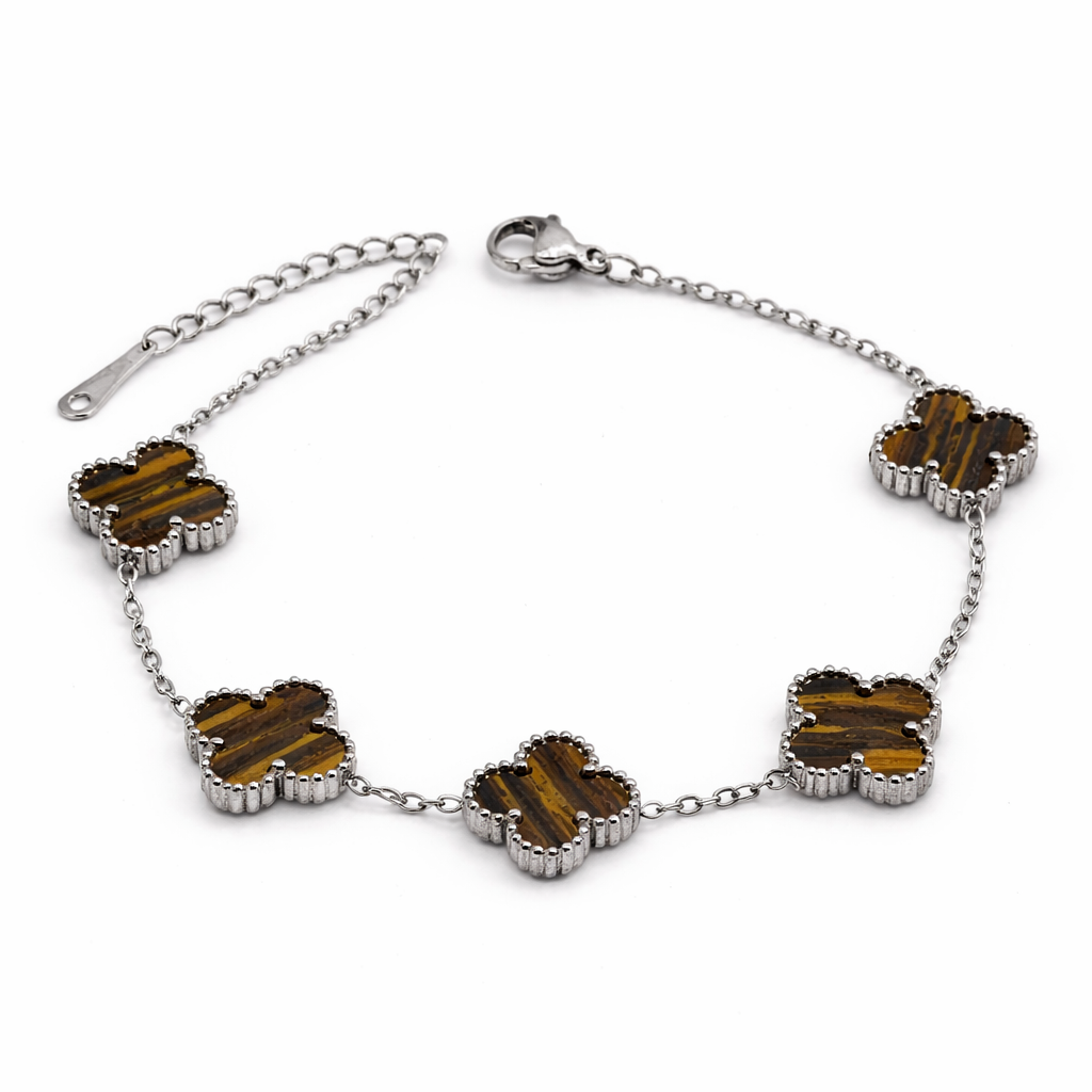 Esta pulsera combina acero inoxidable con piezas decorativas en forma de trébol. El resultado es un diseño limpio, actual y muy femenino.